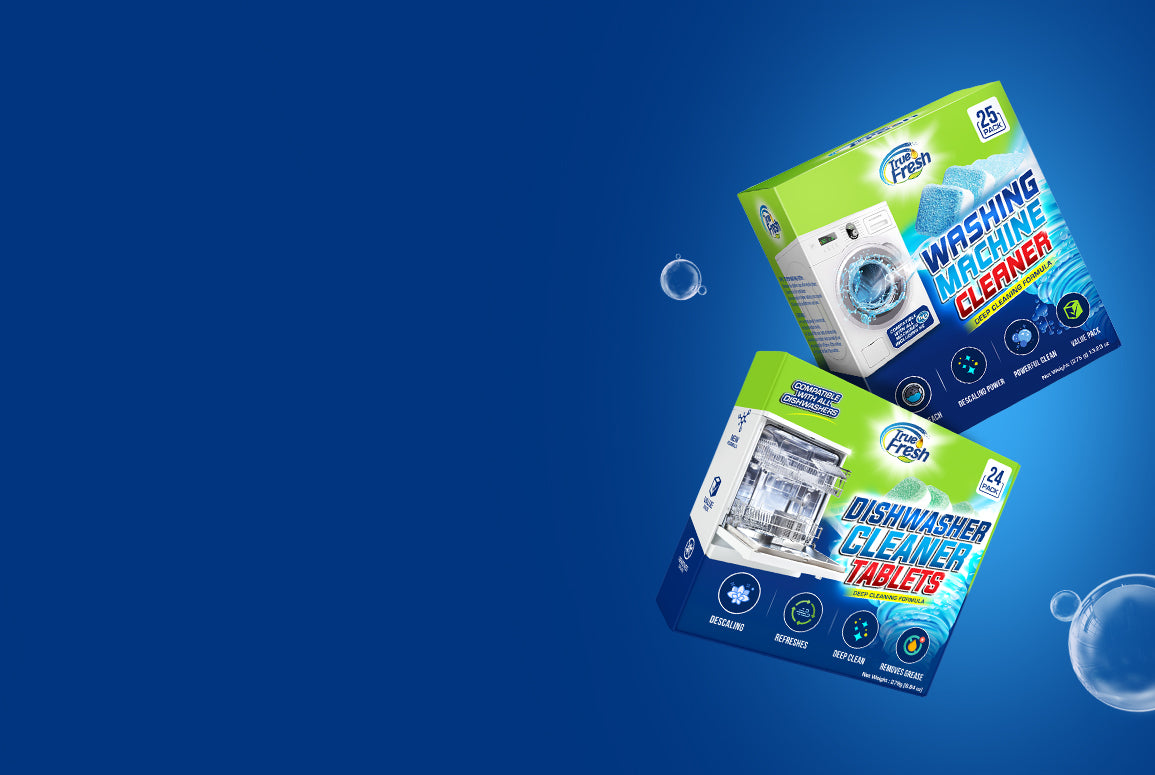 True Fresh Dishwasher Cleaner Tablets dissolve grease, detergent film, and mineral buildup for spotless dishes. Safe for all dishwashers, they maintain optimal performance and keep your kitchen shining with every wash