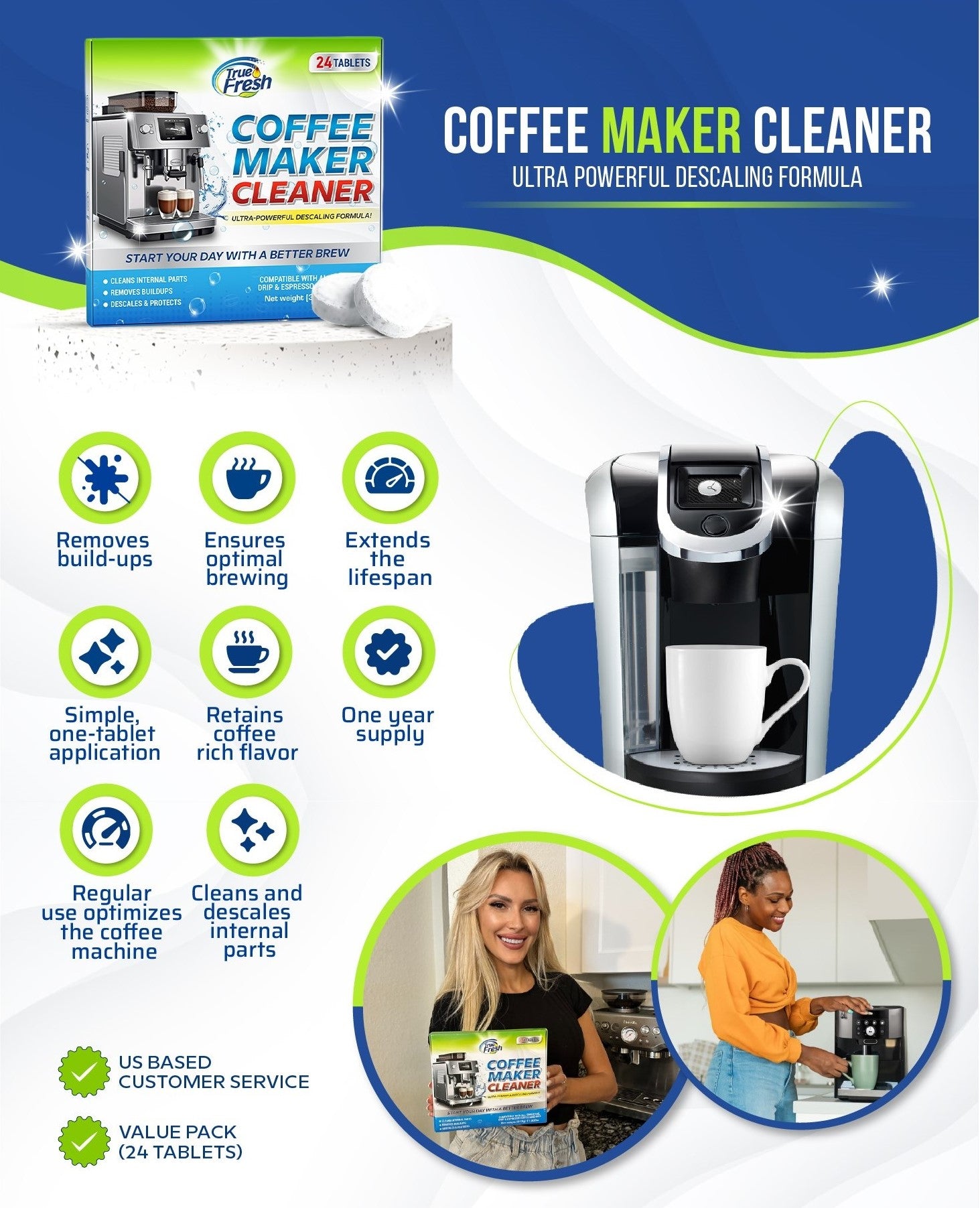 Whether you use an espresso machine, single-serve brewer, or drip coffee maker, True Fresh tablets are designed to clean safely and effectively in all models without damaging internal components.
